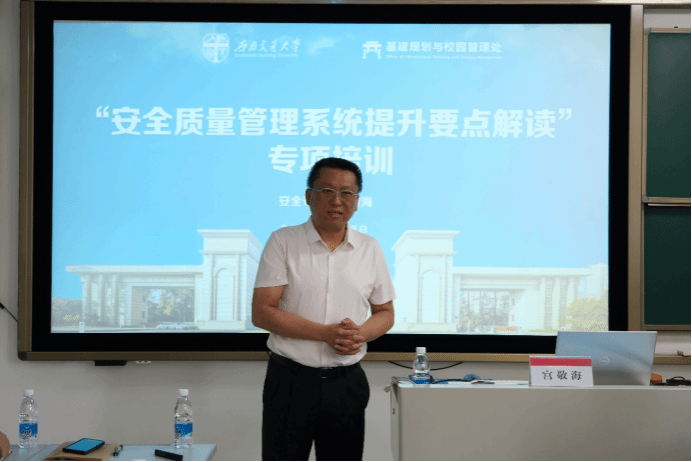 为认真贯彻落实习近平总书记重要指示精神坚决防范遏制重特大事故,全面落实“平安交大”安全生产责任体系,进一步提升在建项目质量安全管理标准化、规范化水平,夯实质量安全基础,2025 年 5 月 28 日上午,建管处组织相关科室和各在建项目施工、监理单位在犀浦校区开展了 “安全质量管理系统提升要点解读” 专项培训交流活动,邀请中铁建工集团西南分公司安全总监宫敬海作了培训报告。