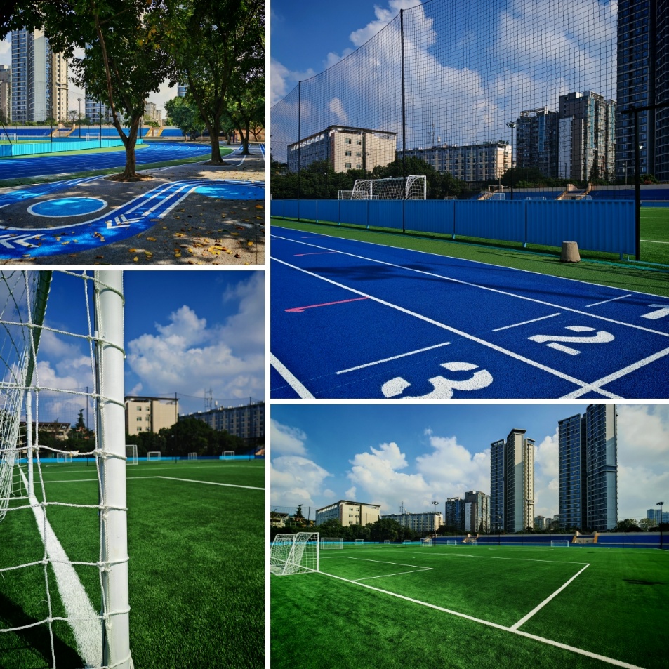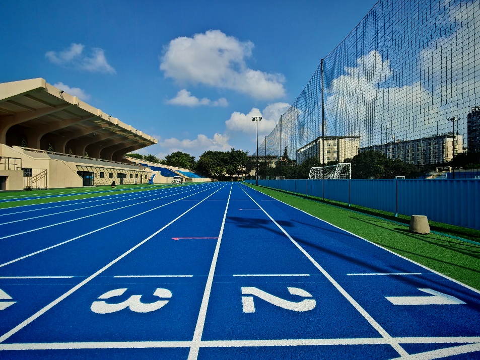 修缮后的九里校区田径场以色彩为笔,勾勒出青春活力的校园图景。塑胶跑道采用柔和明亮的蓝绿渐变配色,EPDM彩色胶粒均匀细腻的表层能有效减少强光反射,既避免运动时的视觉干扰,又与周边绿植形成和谐呼应。足球场的人造草坪选用深绿与浅绿交织的仿真配色,模拟天然草坪的视觉层次,搭配跑道的明快色调,让整个运动区域在阳光下焕发勃勃生机,成为校园里极具辨识度的风景线。
