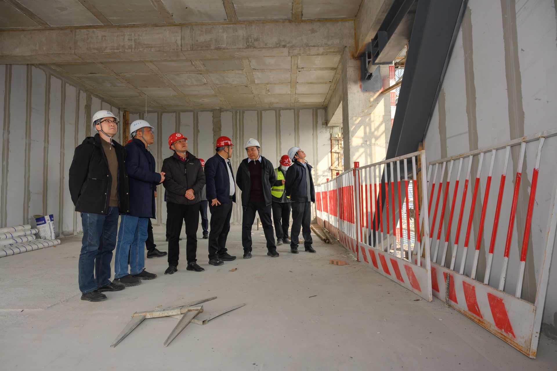 南区学生公寓项目建设进展顺利,主体结构已进入收尾阶段,即将实现封顶。检查组仔细查看了主体结构混凝土浇筑质量等关键环节,对项目推进效率给予肯定。针对后续施工,检查组要求施工单位提前谋划主体封顶后的二次结构施工及装饰装修准备工作,做好各工序衔接,确保工程质量与进度同步推进。