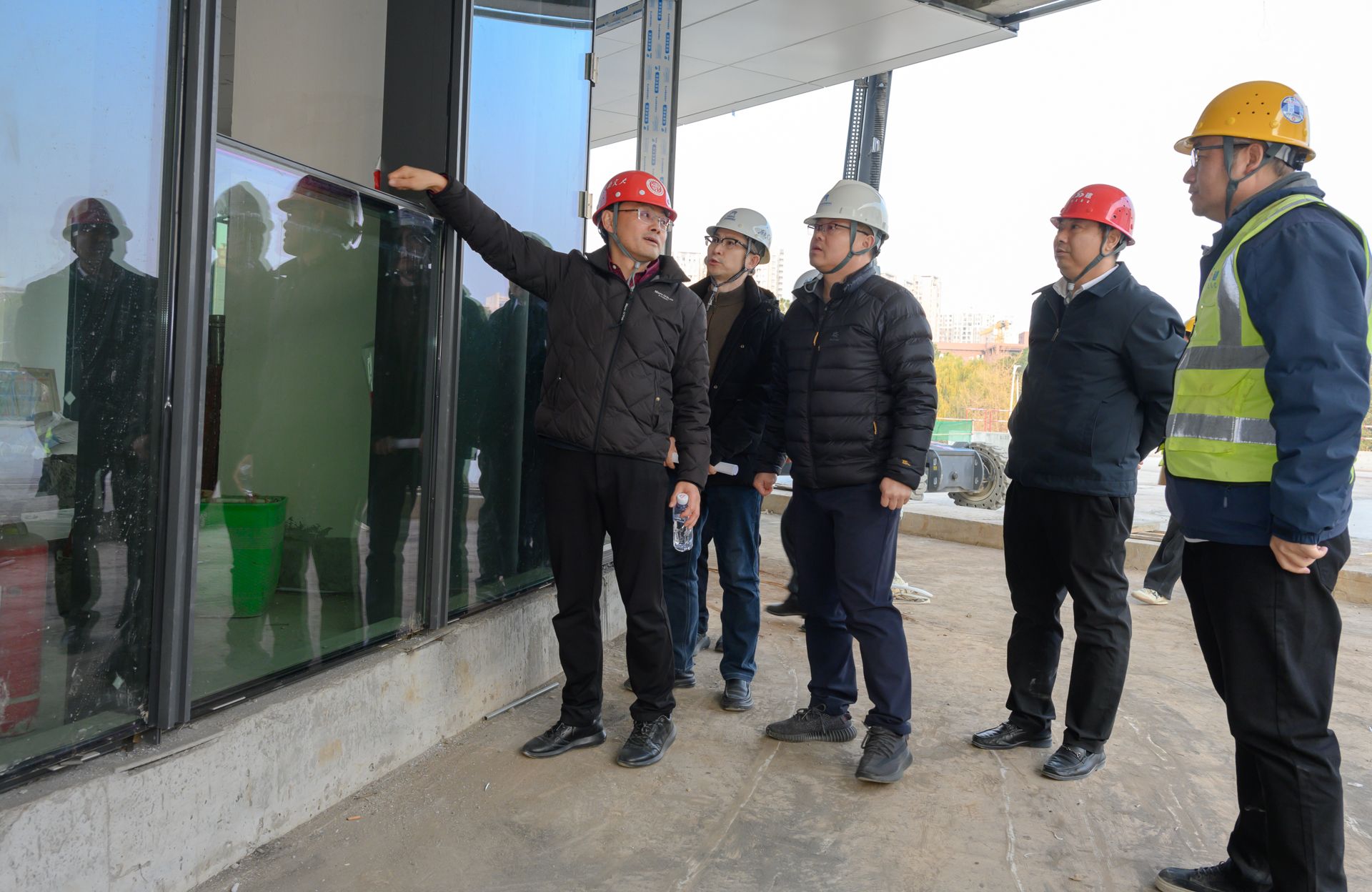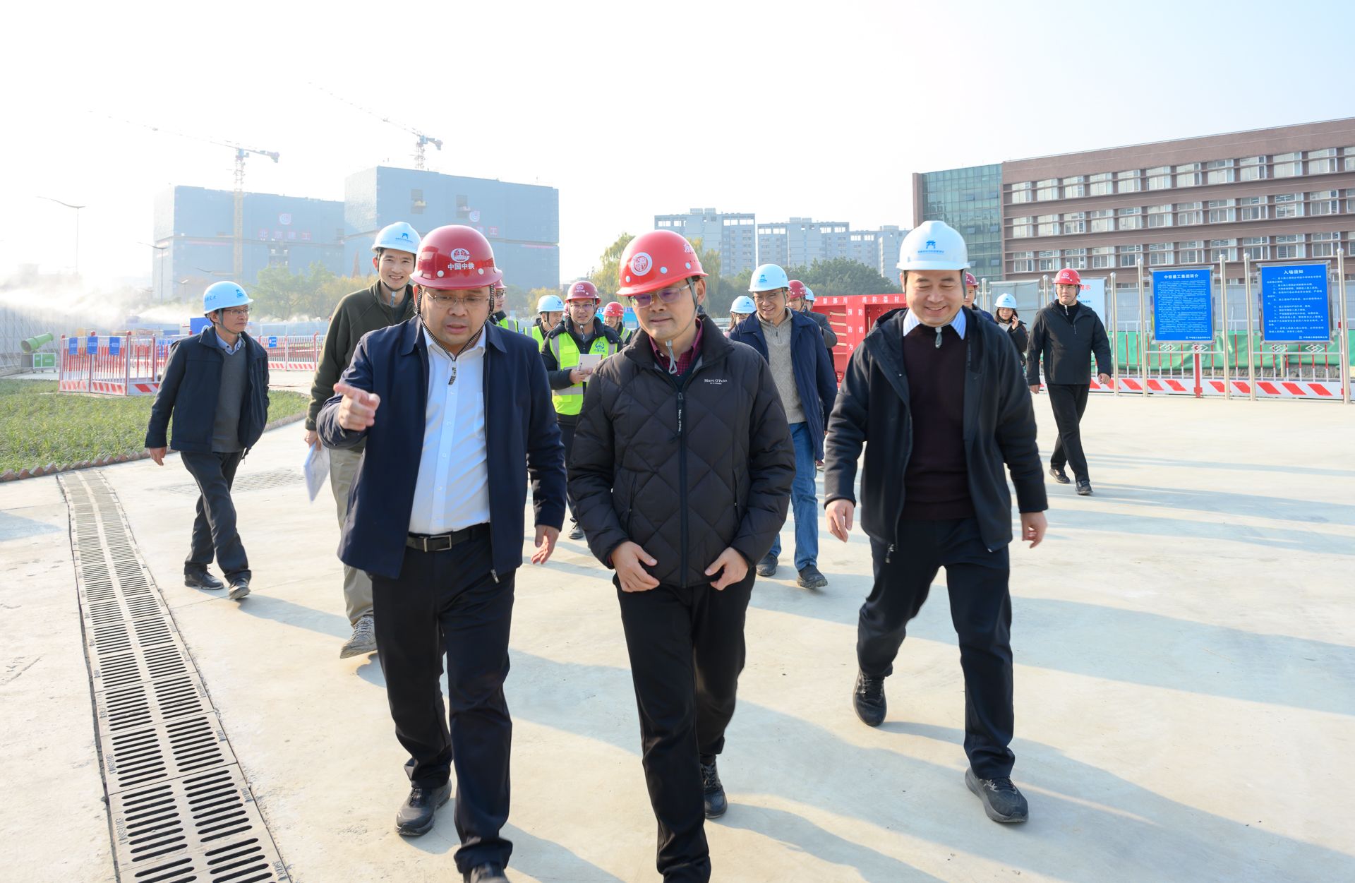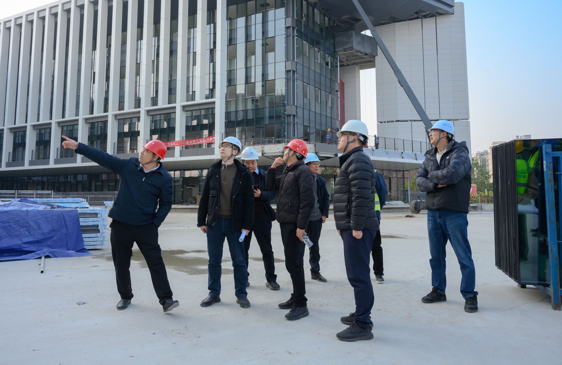 双创中心项目现场同样呈现出繁忙有序的施工景象,该项目外立面幕墙施工已进入尾声,玻璃及石材幕墙安装工作顺利推进,建筑外观雏形初现。目前项目已全面转入室内装修和安装阶段,施工人员正有序开展地面铺装、墙面装饰、机电设备安装等作业。检查组仔细查看了幕墙安装质量及室内装修材料,要求施工单位严格把控装修工艺和材料质量,注重施工细节,确保项目建成后既能满足功能需求,又能保障师生使用安全与舒适。
