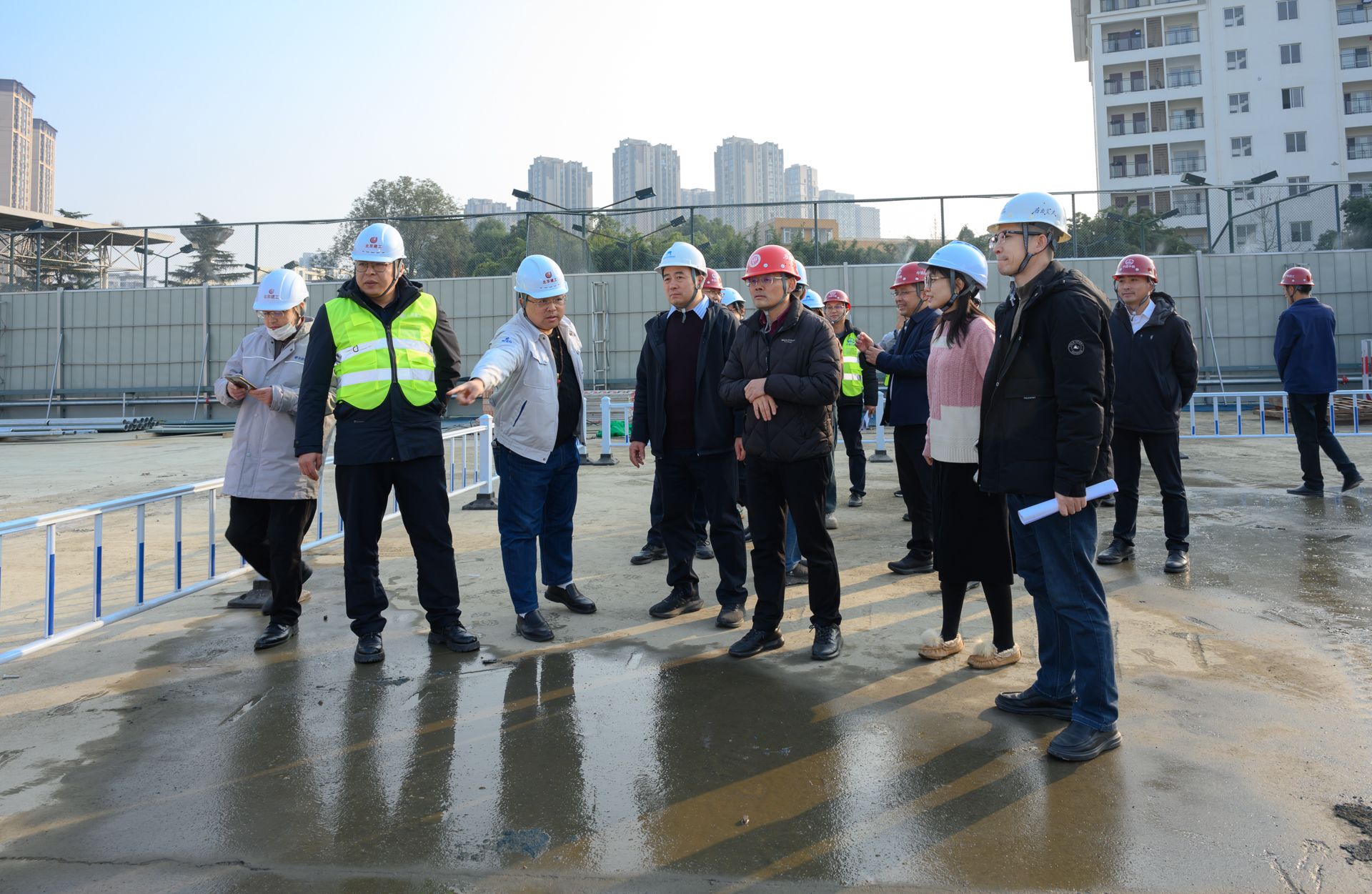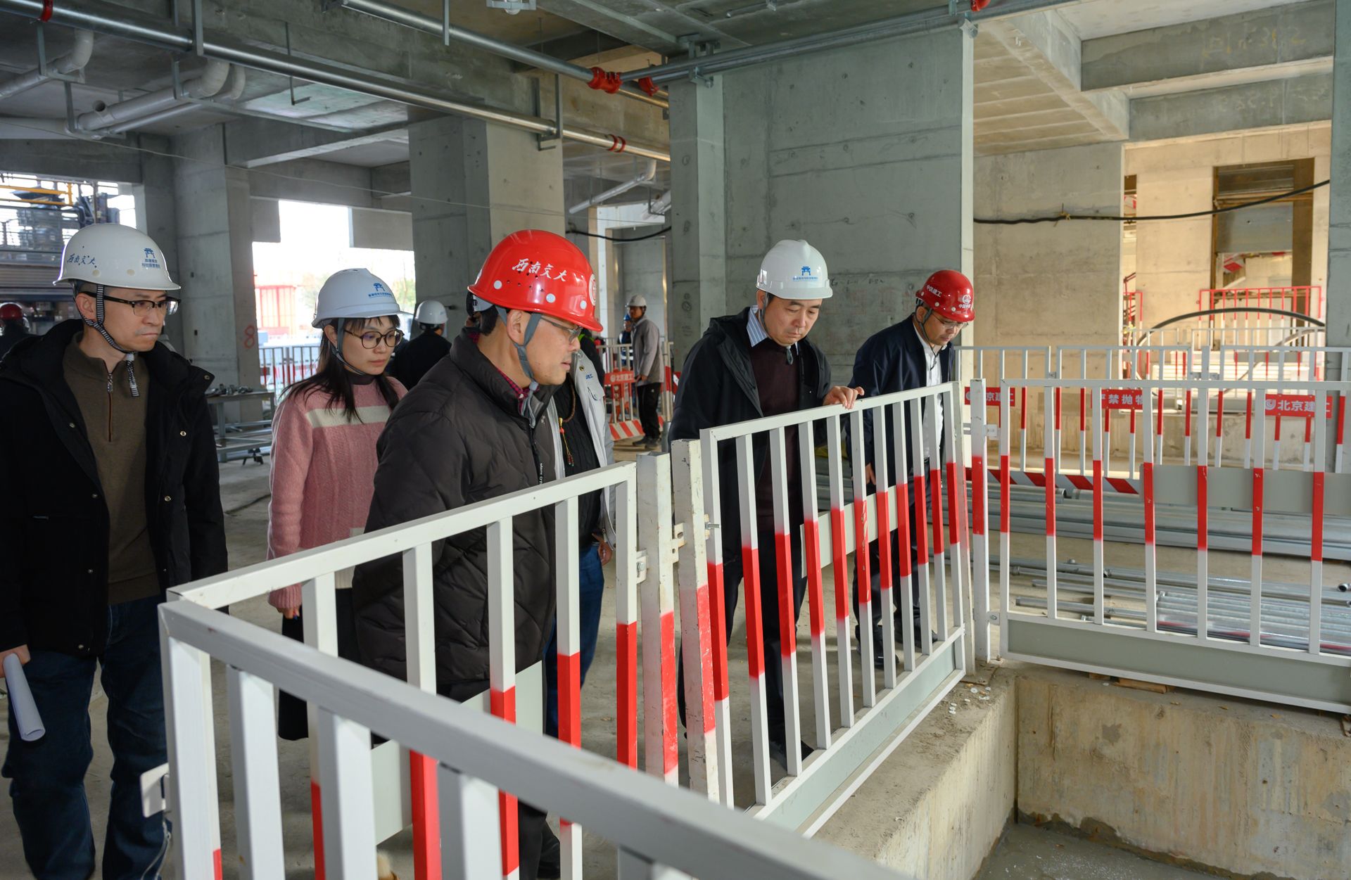 检查组一行先后前往川藏铁路研究中心项目、七号食堂项目、南区学生公寓(二期)项目、南区学生公寓项目、双创中心项目及学生宿舍及宿舍配套用房修缮改造项目(二期)一阶段项目施工现场。每到一处,检查组都仔细察看工程建设进展状况,详细询问质量管控体系建设、安全管理制度落实、施工人员岗前培训及应急预案制定等情况,重点核查了施工材料质量、关键工序施工工艺及现场安全防护措施等关键环节。各项目组长及施工单位项目经理分别就项目当前进展、存在的难点问题及下一步工作计划向检查组作了详细汇报,检查组针对各项目实际情况提出了针对性指导意见。