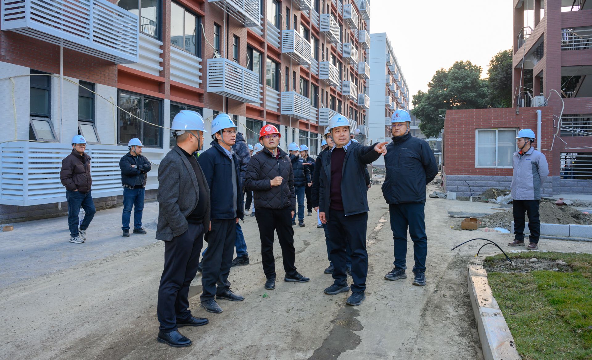 宿舍配套用房修缮改造项目(二期)一阶段项目聚焦师生居住环境提升,目前外立面整改工作已接近尾声,项目全面进入总平施工阶段。现场可见宿舍外立面焕然一新,施工人员正有序开展场地硬化、绿化种植、管网铺设等总平工程作业。刘长军副校长强调,宿舍修缮关系到师生切身利益,要严格把控施工质量,注重细节处理,全力打造安全、舒适、美观的居住环境,确保项目按期交付使用。