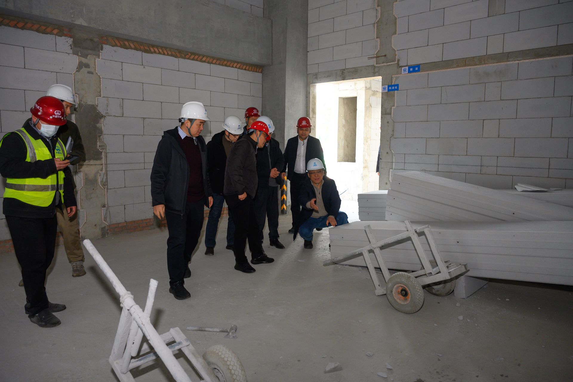 在川藏铁路研究中心项目施工现场,该项目主体结构已顺利封顶,目前已全面转入隔墙砌筑及机电设备安装阶段。现场可见施工人员正有条不紊地进行加气混凝土砌块砌筑、管线预埋等作业,各项工序衔接有序。检查组要求施工单位严格把控隔墙砌筑质量,确保墙体垂直度、平整度符合规范要求,同时加强机电安装环节的安全监管,保障施工过程安全可控。